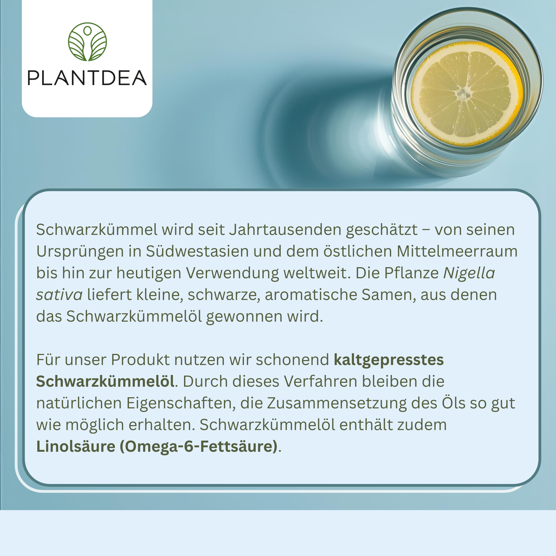 Das Schwarzkümmelöl stammt aus zertifiziert ökologischem Anbau und wird unter kontrollierten Bedingungen in Deutschland zu Kapseln verarbeitet. Dabei bleiben die natürlichen Bestandteile, insbesondere die enthaltene Linolsäure (Omega-6-Fettsäure), bestmöglich erhalten – ohne Zusatzstoffe, ohne Füllstoffe, ohne künstliche Trennmittel.